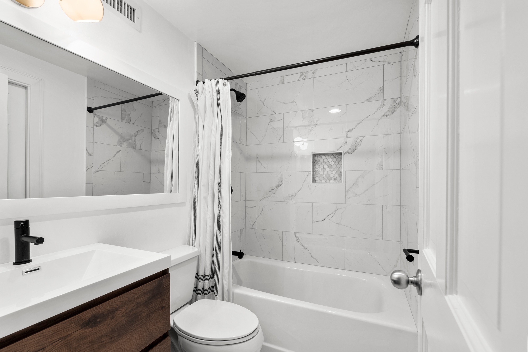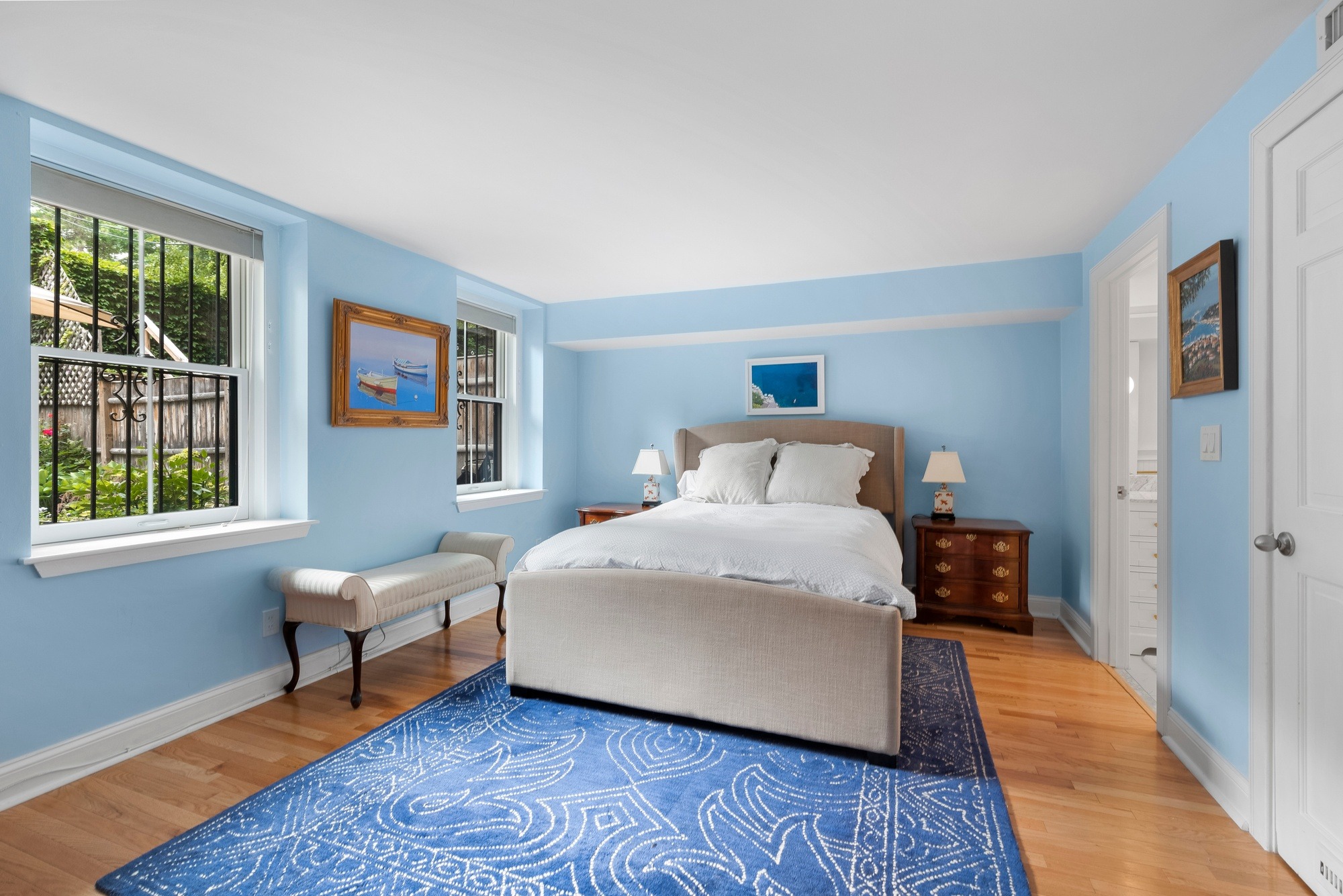 Downstairs leads directly to the garden and two generous bedrooms with en-suite baths. The sunny master bedroom fits a King sized bed, has a walk-in closet and a newly renovated bathroom with glass shower and marble flooring The second bedroom is also large enough for a King size bed, has a bath with shower/tub, and a large walk-in closet with bonus extra storage.Â
