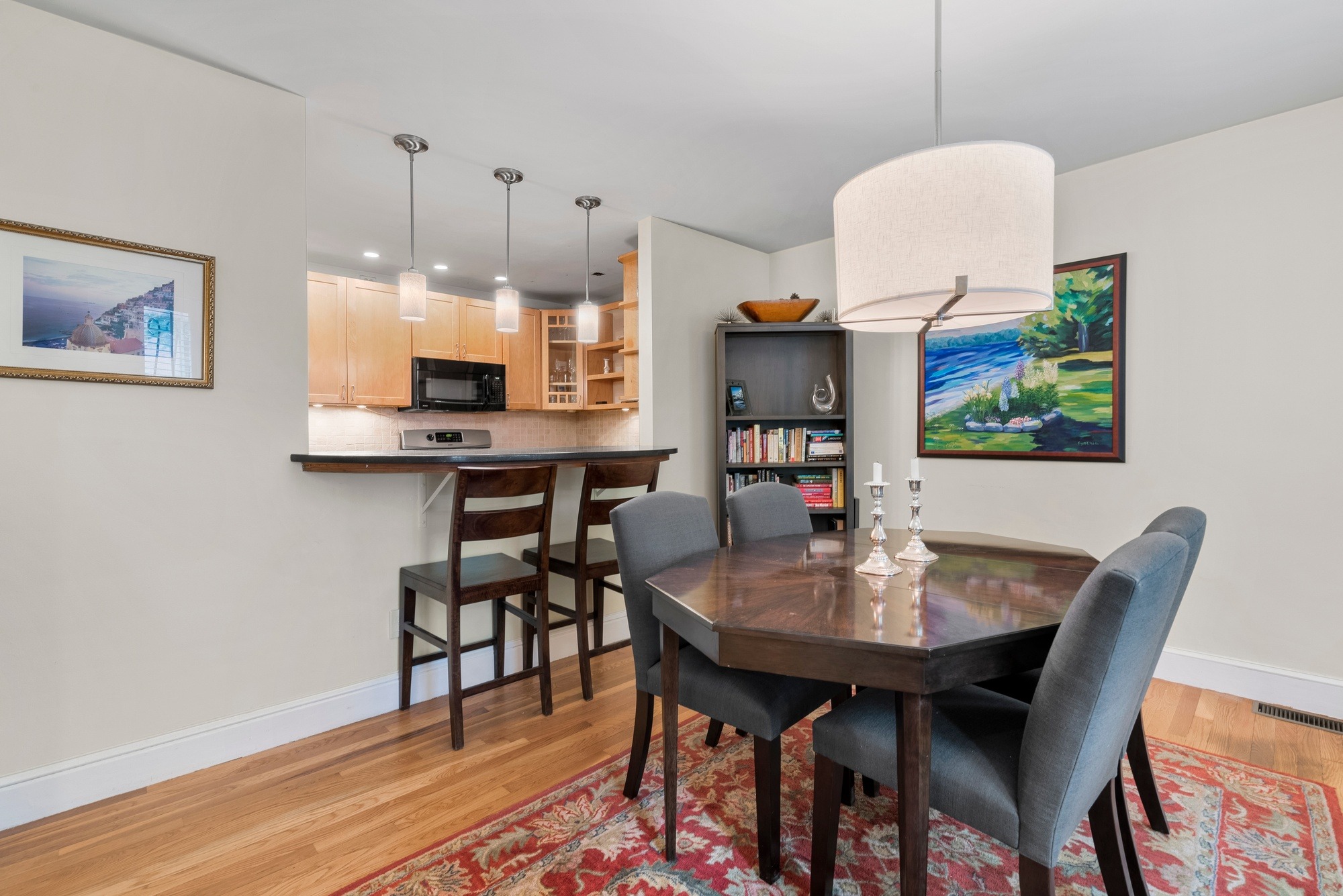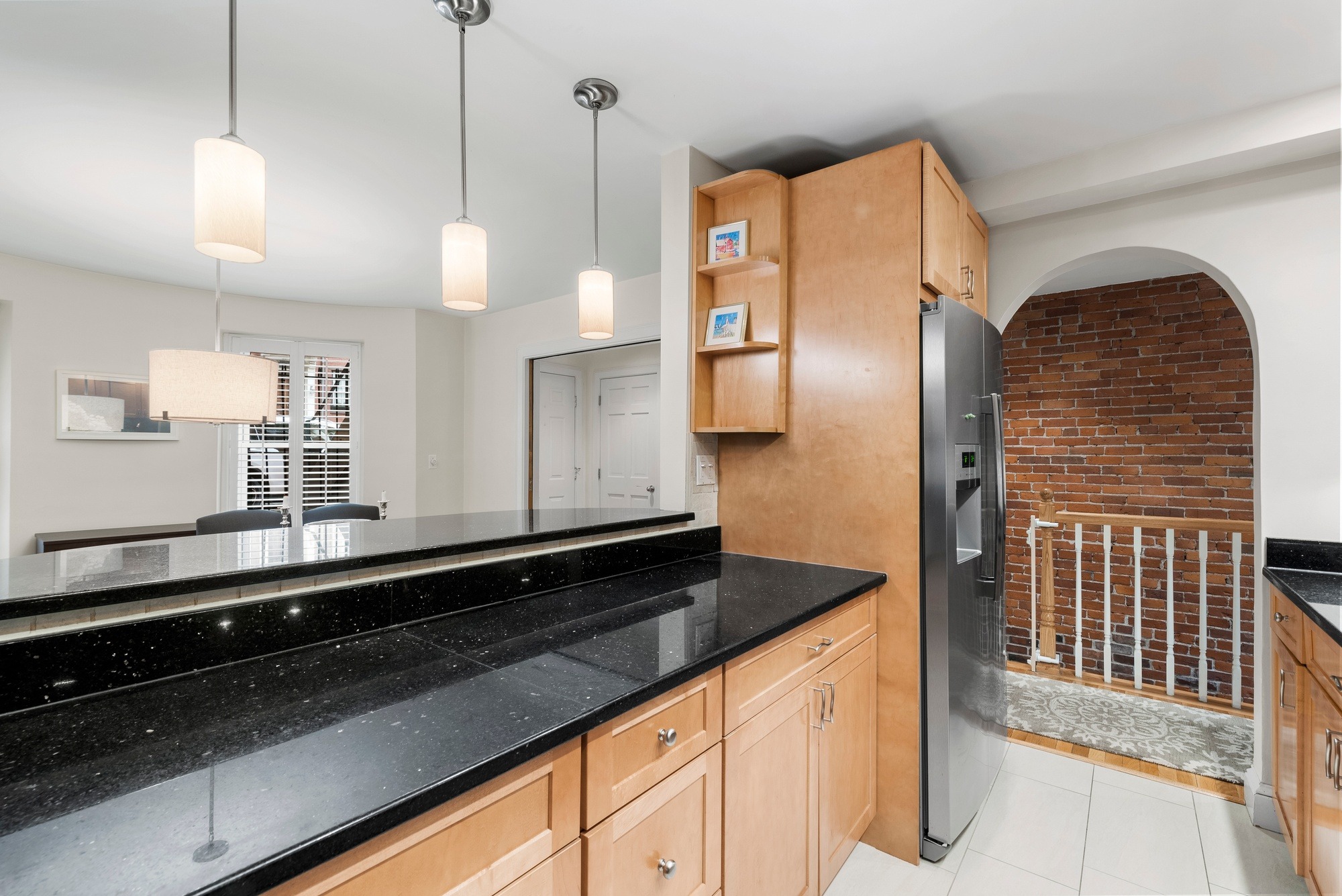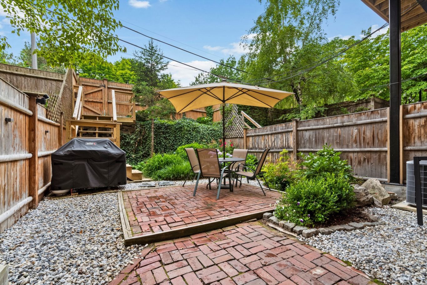The upper level has a bow-front dining room with a pass-through breakfast bar next to the kitchen. Granite and stainless kitchen with gas cooking. A gracious living room, large enough for a home office on one end, spans the back of the building and overlooks an extraordinary garden with brick patio and raised flower beds. There is a powder room on the upper level.Â
