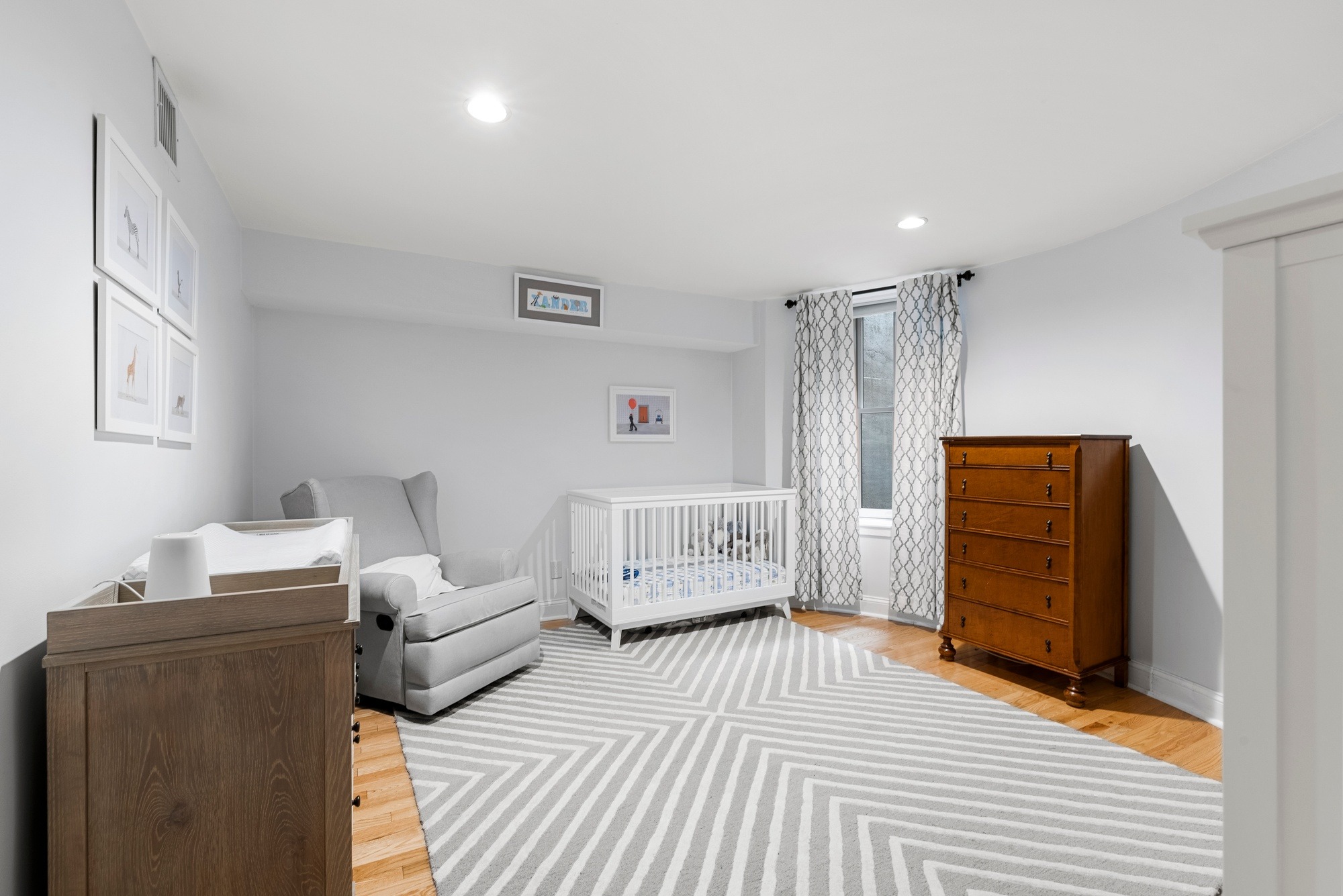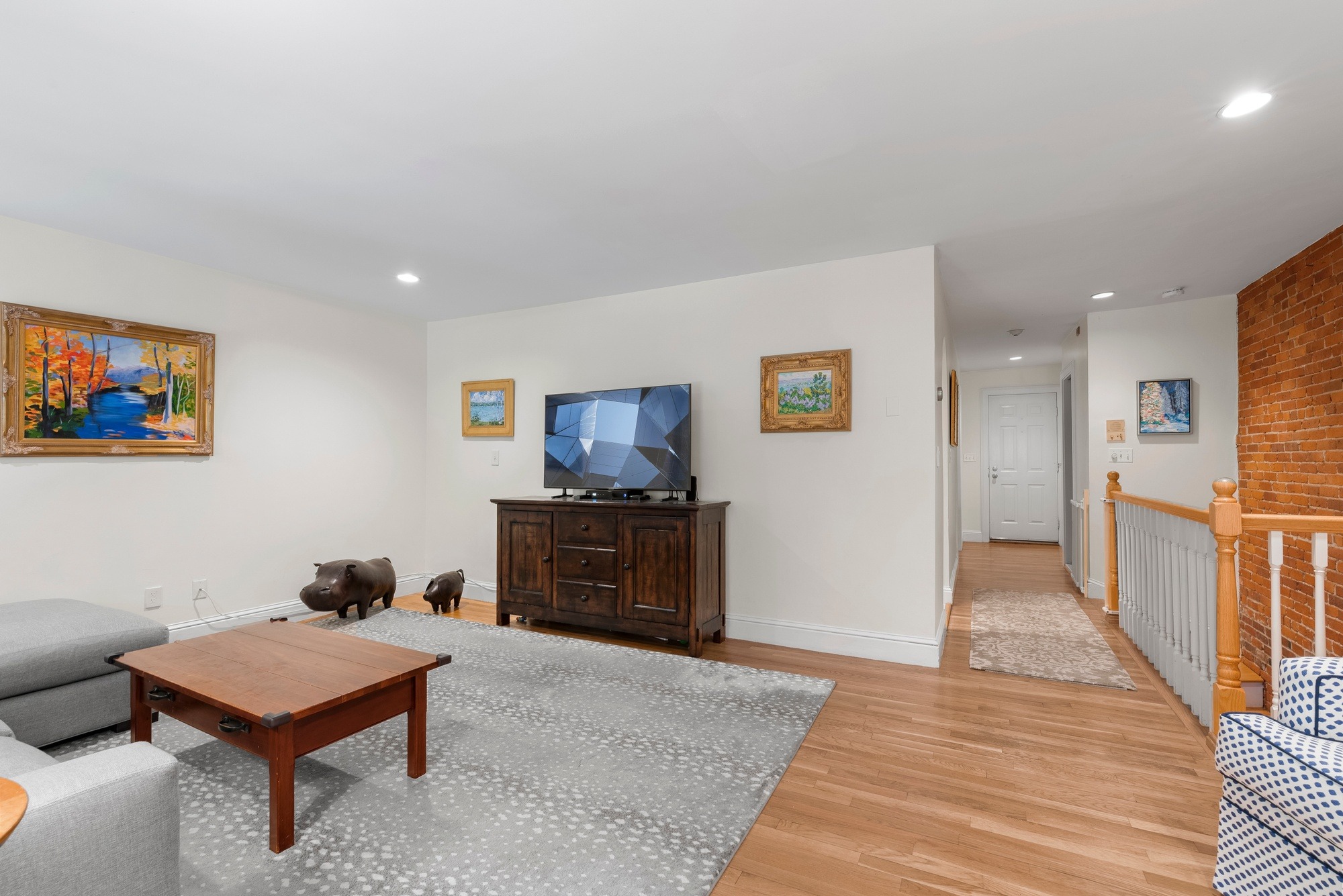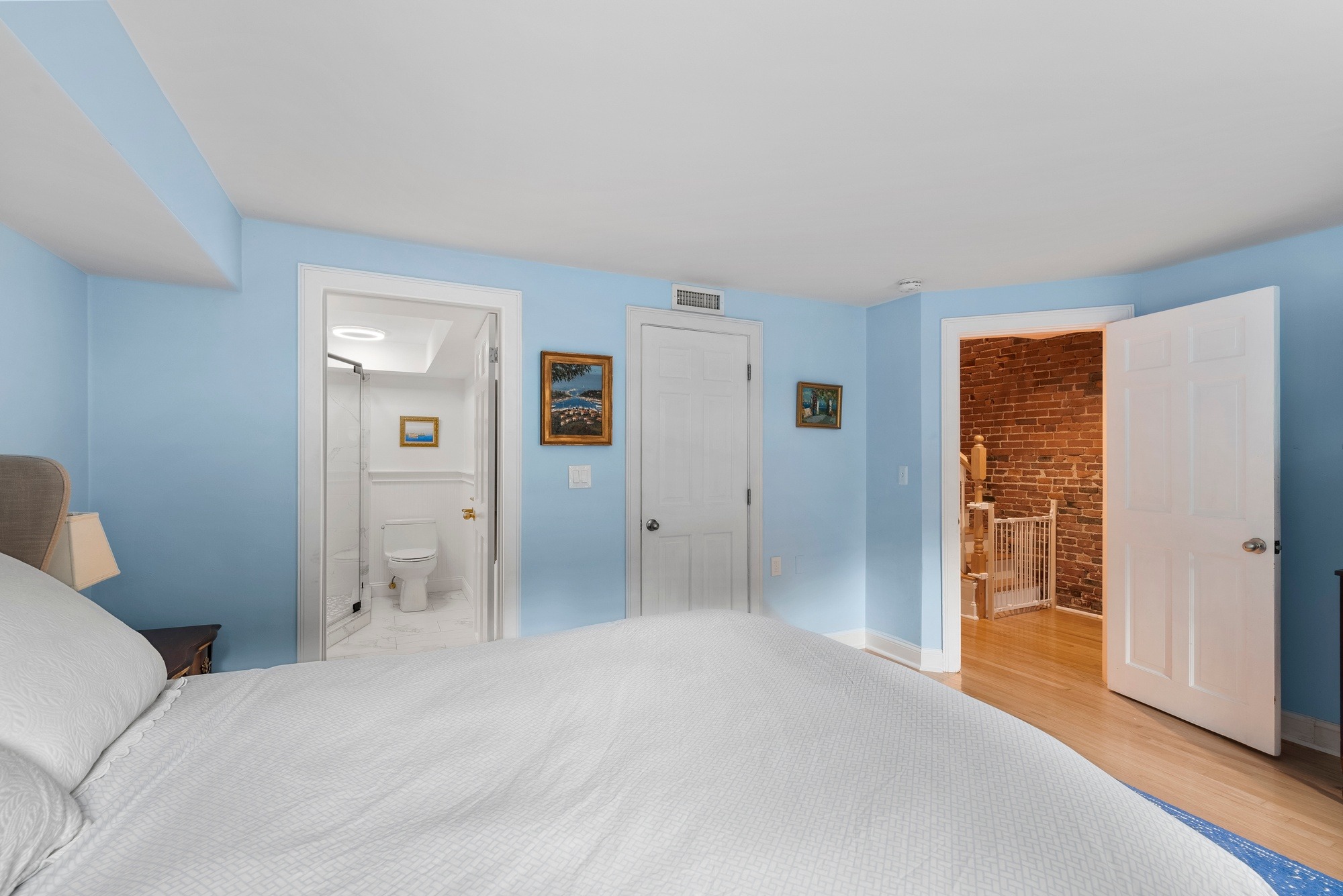 The upper level has a bow-front dining room with a pass-through breakfast bar next to the kitchen. Granite and stainless kitchen with gas cooking. A gracious living room, large enough for a home office on one end, spans the back of the building and overlooks an extraordinary garden with brick patio and raised flower beds. There is a powder room on the upper level.Â