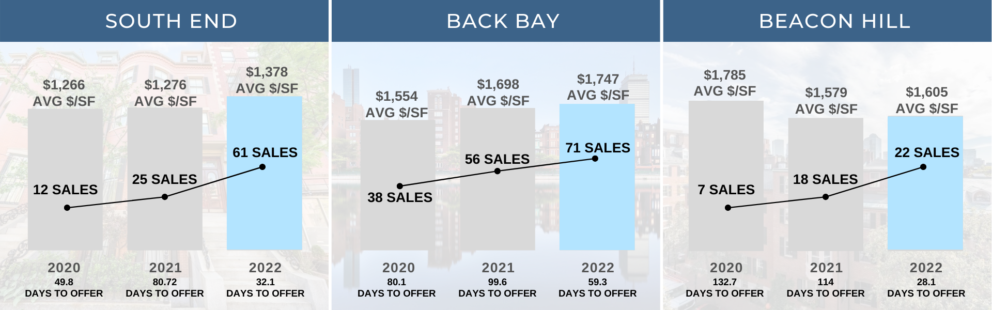 For context, 2021 featured four deals over $1,500/SF for the entire year in this category. There were six deals that closed for over $1,440/SF in all of 2021 whereas we’ve already had ten such deals in the first half of 2022. There are at least six more deals under agreement in the South End that will close for between $1,420 and $1,575/SF this calendar year and that ignores future supply that we don’t know about yet.