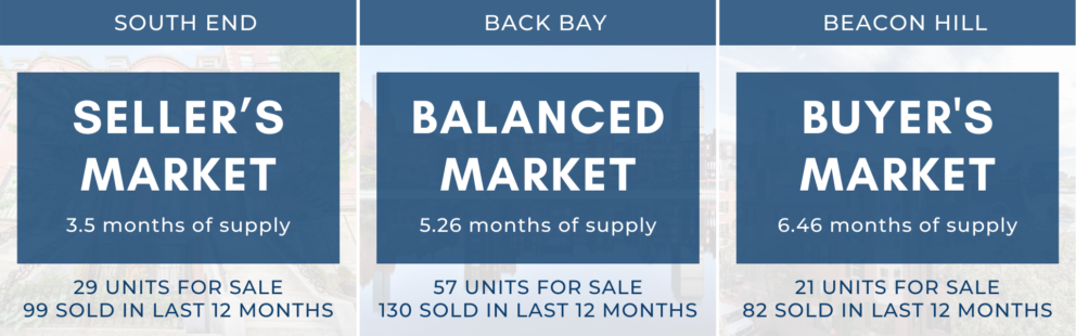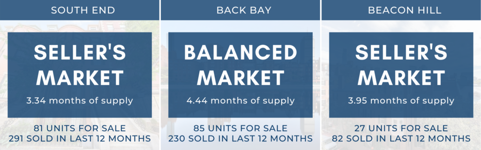 - 81 units for sale in the South End : 291 sold in last 12 months = 3.34 months of supply