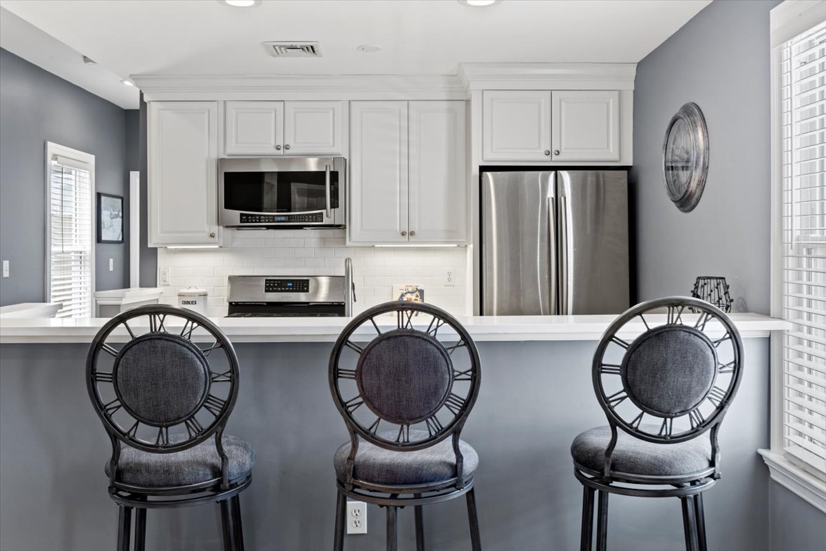 The kitchen features stainless steel appliances and ultra white quartz counter tops, textured Subway tile backsplash and Quartz breakfast bar! At 950 square feet, this home offers open concept living space for great flexibility to meet a variety of needs. The space is enhanced by a Wood Burning Fireplace!