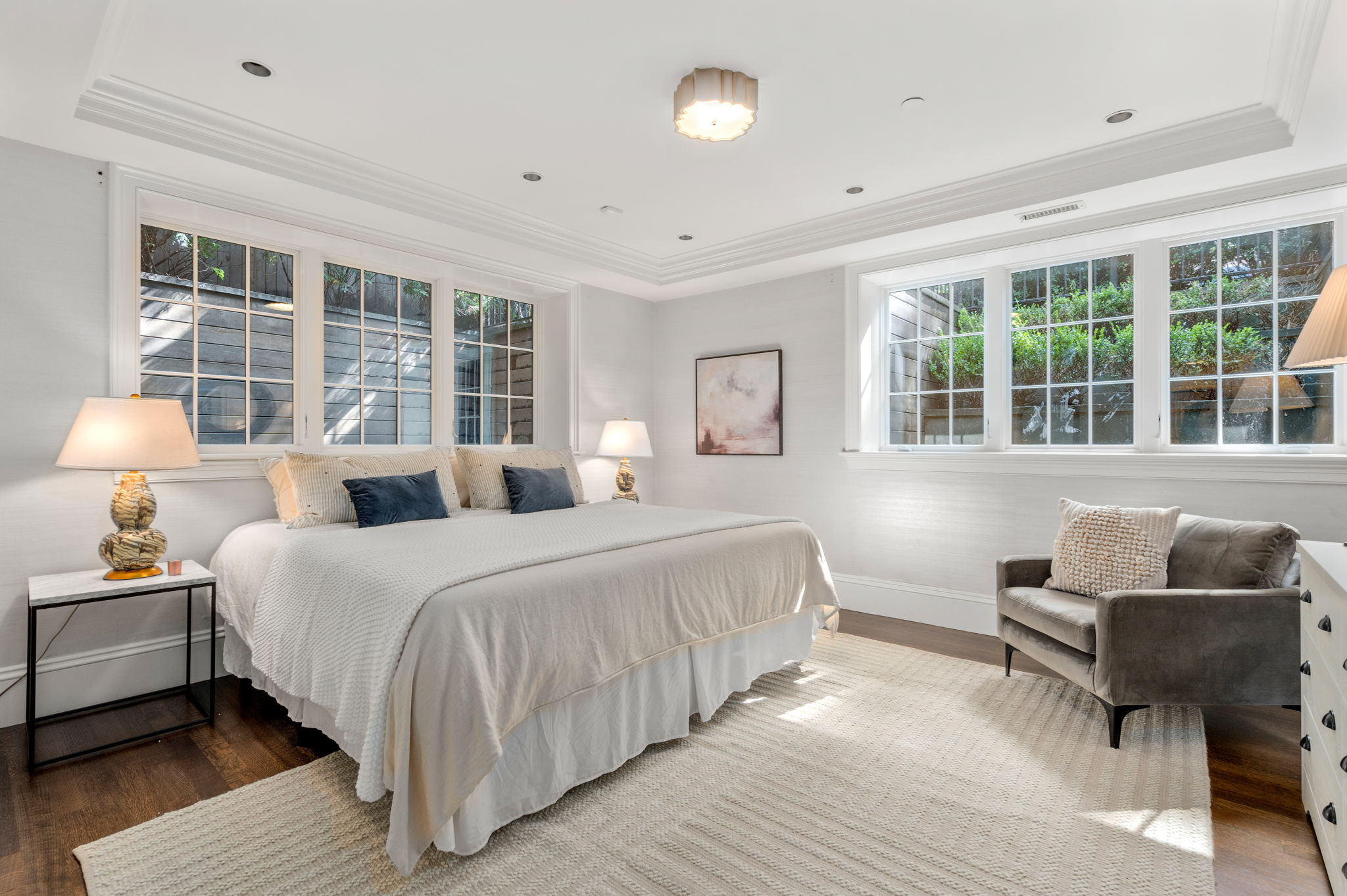 On the lower level, the home’s quieter rhythms take over. Three spacious bedrooms make up this space, including a primary suite with corner garden views that feel almost cinematic. A pristine en-suite bath completes the retreat. Two additional bedrooms offer remarkable flexibility for guests, family, or a beautifully appointed office.