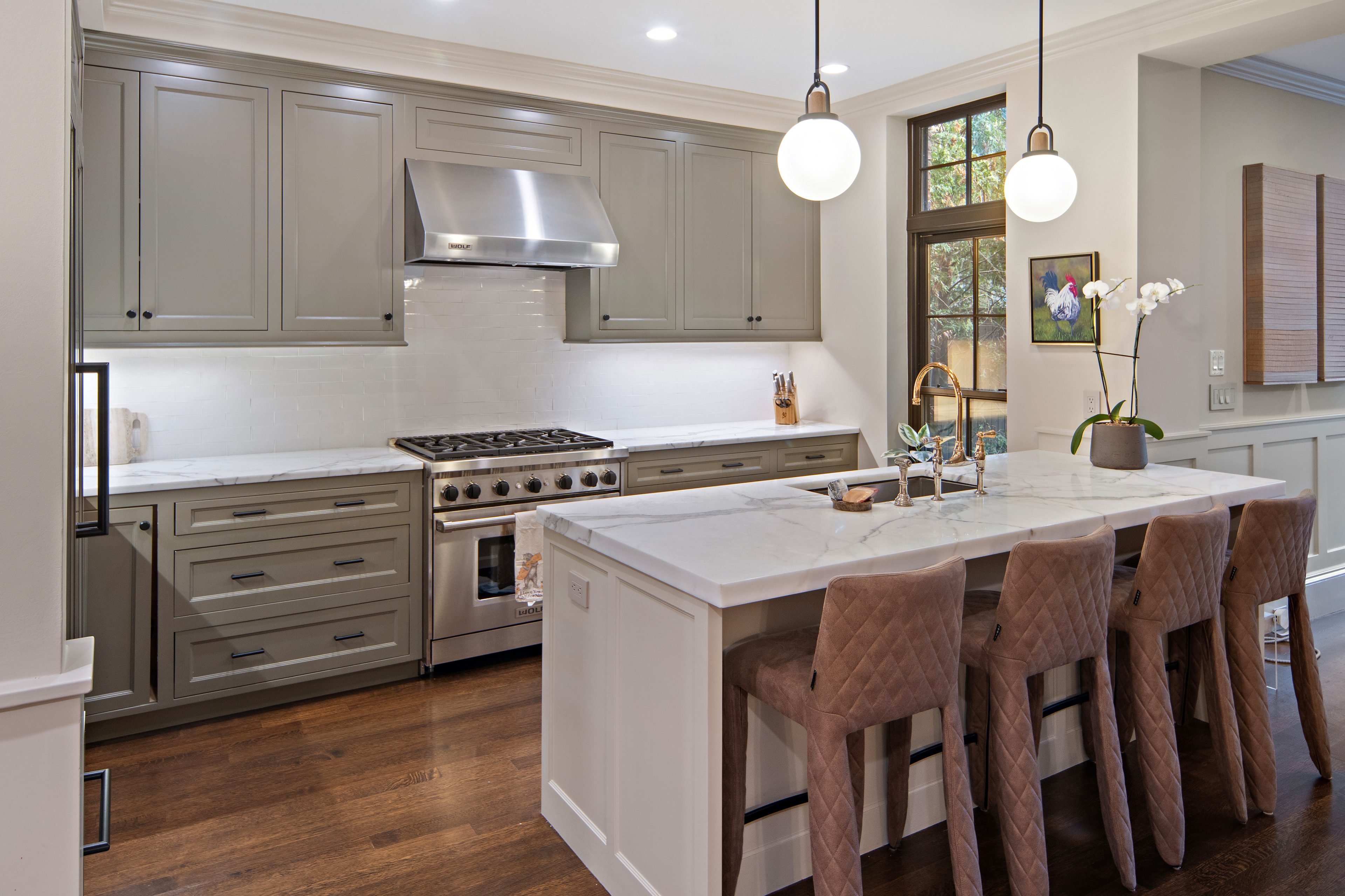 Move toward the heart of the home and the architecture begins to open up. A custom kitchen—crafted for both performance and beauty—anchors the main living level. Wolf and Sub-Zero appliances, marble counters, and elegant cabinetry create the chef’s atelier. This space is as photogenic as it is functional. Just beyond, floor-to-ceiling south-facing windows transform the space into a greenhouse-like sanctuary, bathing the room in natural light throughout the day.