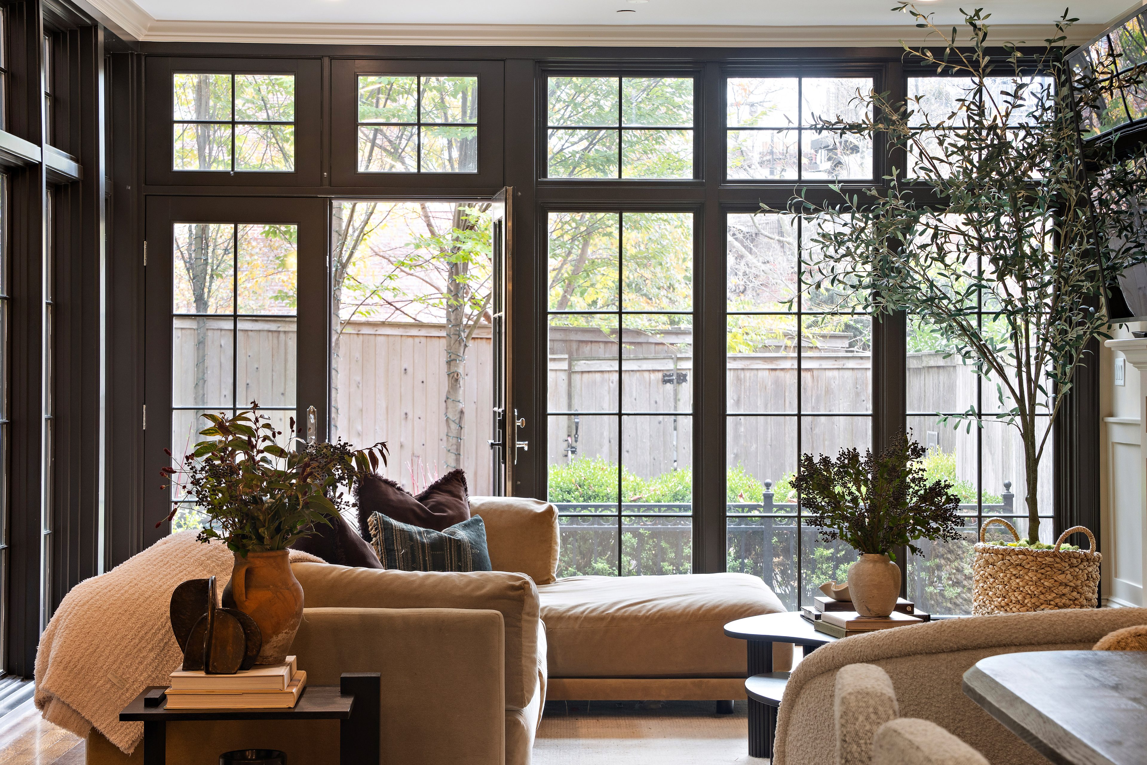 Through oversized French doors, the private garden reveals itself— a lush oasis in the center of the city. Mature trees sway above a bluestone patio, custom landscape lighting glows softly at dusk, and the entire space feels transported from a different world. It’s intimate, atmospheric, and utterly unforgettable.