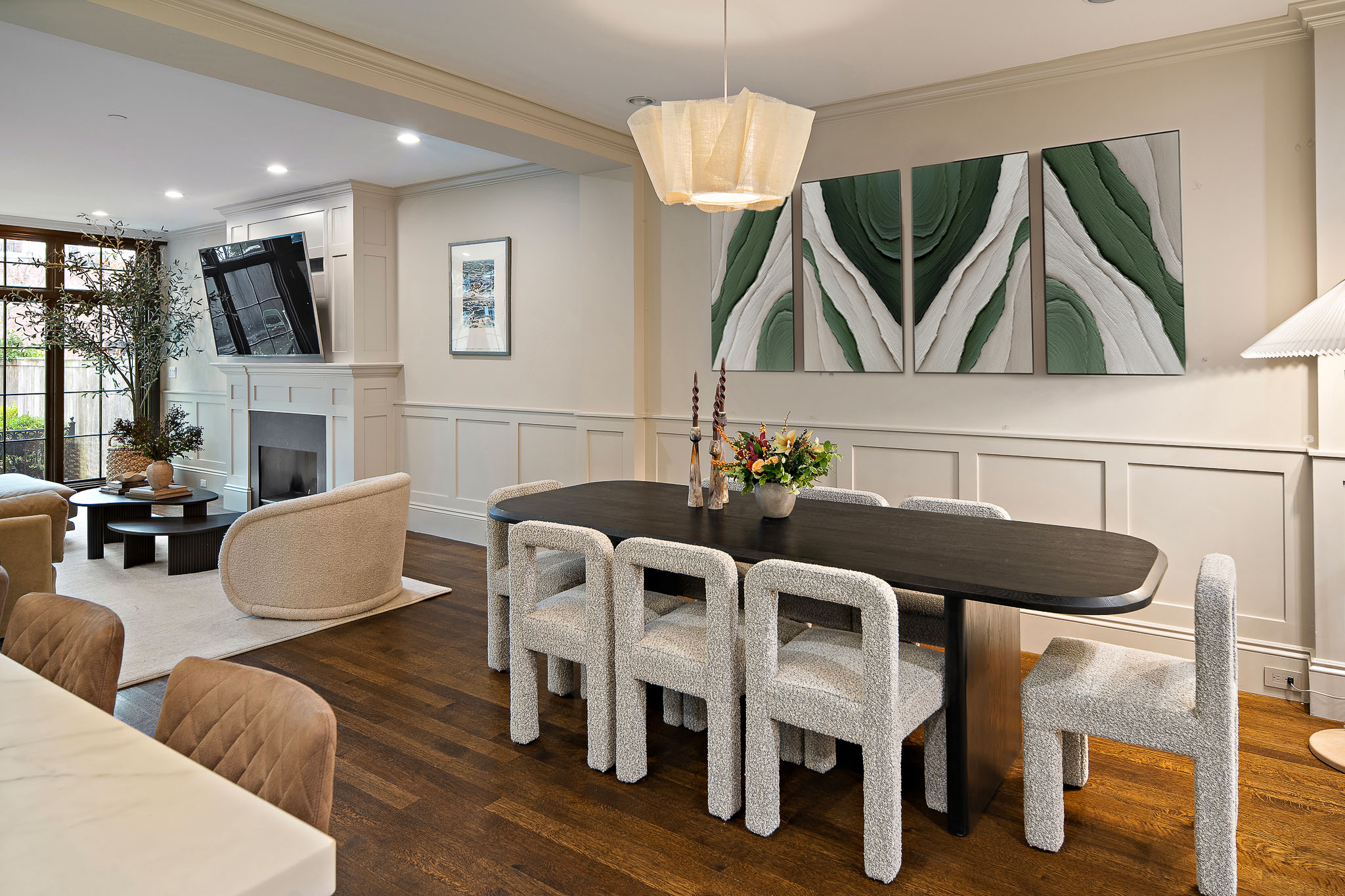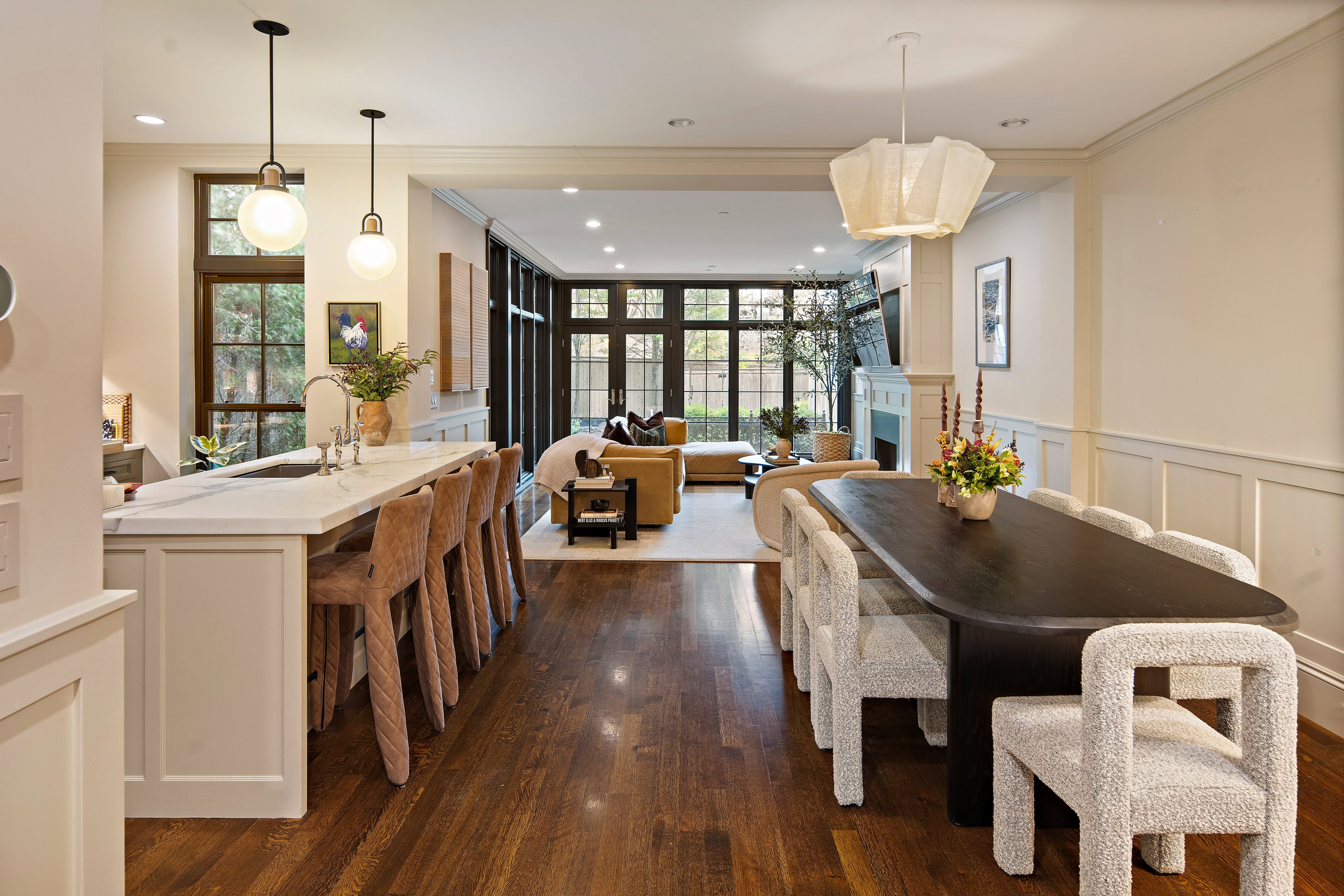 The parlor is just your introduction. Sunlight pours in, warming the sculptural gas fireplace and perfectly tailored built-ins. Every design moment feels intentional, every detail curated. It’s inviting in the way the best interiors are—calm and composed.