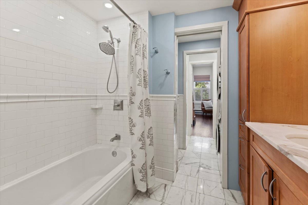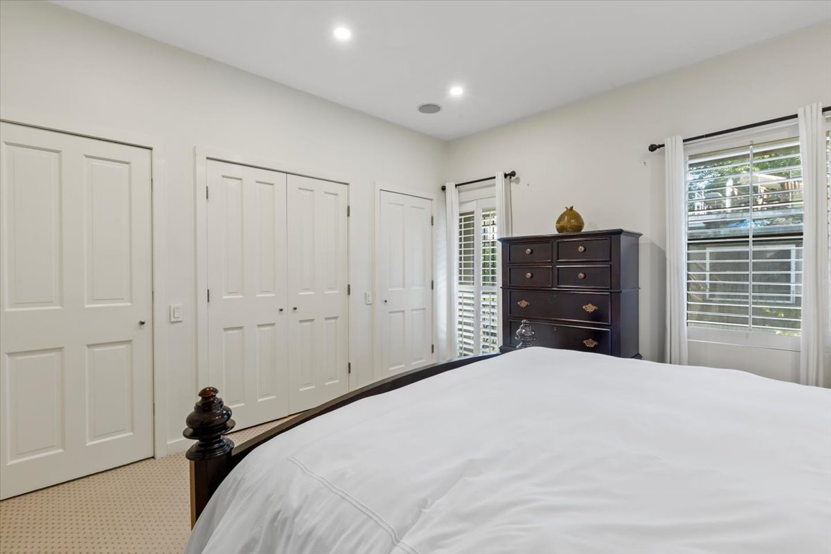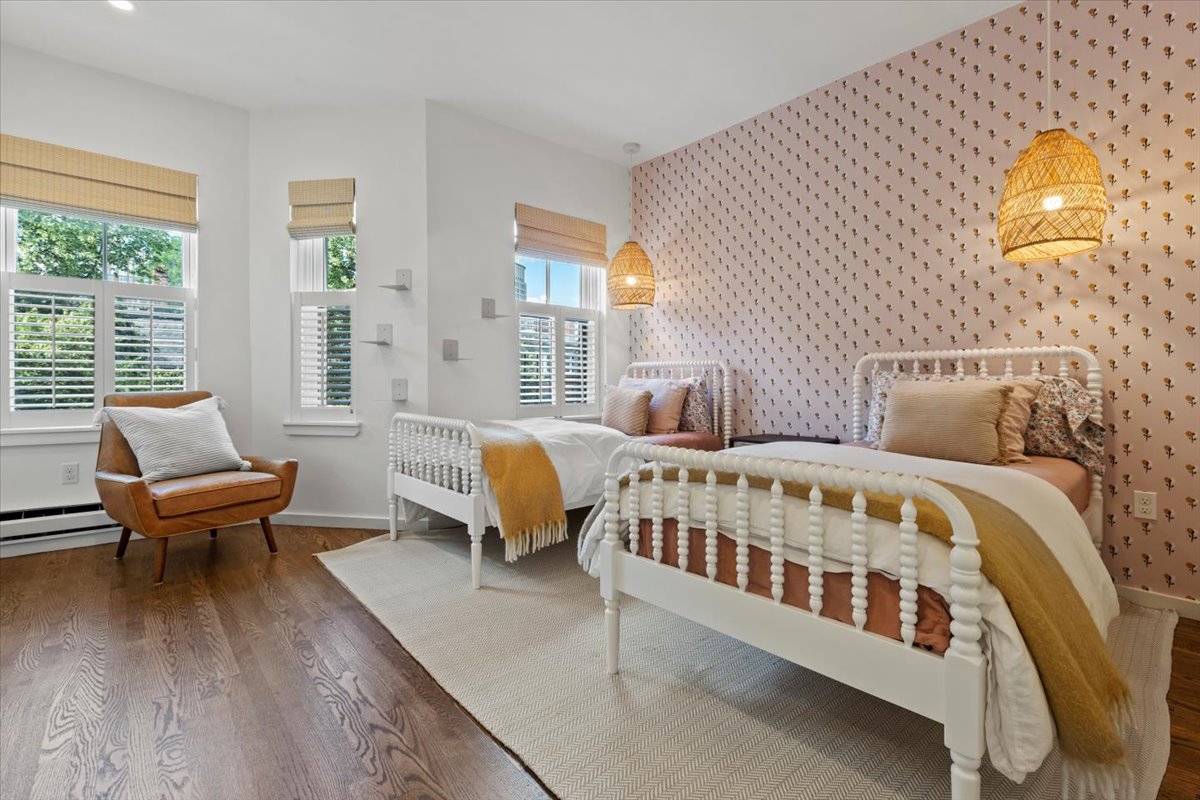 The next two bedrooms are just up the stairs. The primary bed offers its own Parisian style balcony immediately off the sleeping area. A wall full of custom closets provides ample space for clothing and belongings. The room connects to a marble bath with shower and tub. . The second bedroom is also large and currently configured with two twin beds. The room also has floor to ceiling built in closets with a custom sliding ladder to increase functionality. A second bathroom plus laundry area opens directly onto this room.