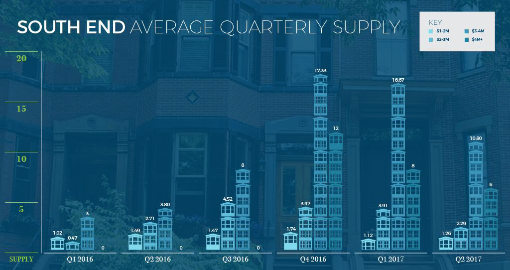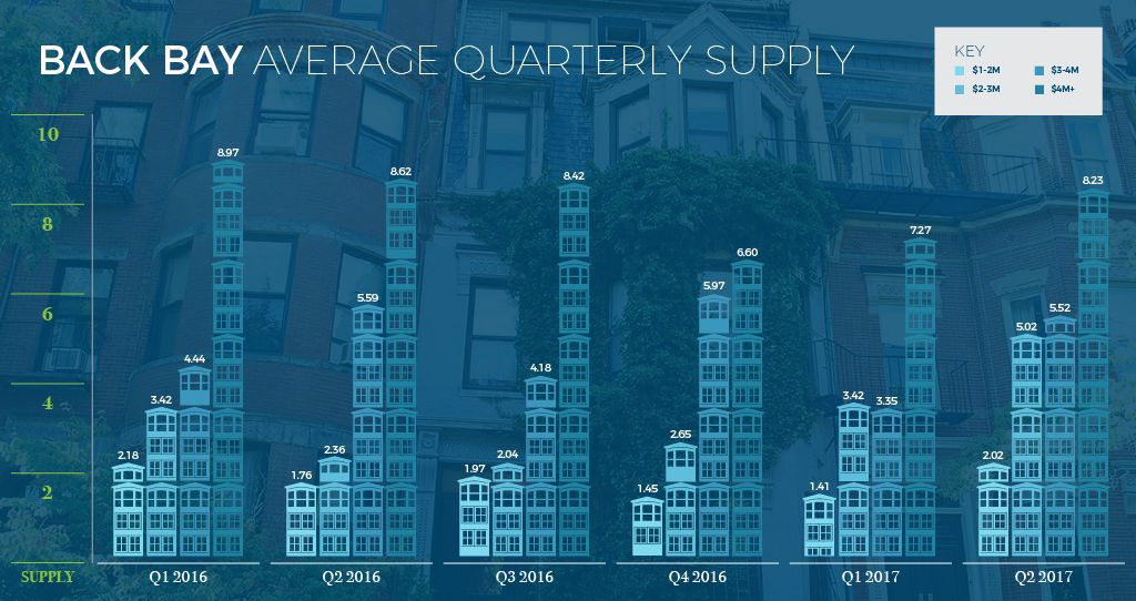 Review the charts below to see how supply has changed over the last 6 quarters in the Back Bay and South End. In the South End, in particular, there is