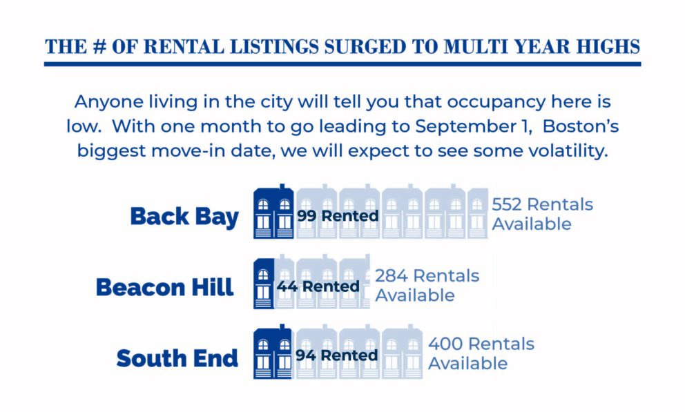 There are currently 400 rentals available in the South End, 552 rentals available in the Back Bay, and 284 rentals available in Beacon Hill. In 2019, between June 1 and August 31, 264 units rented in the South End, 326 rented in Back Bay and 166rented in Beacon Hill. From the data taken from MLS, as of 7/30/20 there is a 4 month supply on the market in the South End, 5 ½ months of rental supply for Back Bay and 3 months of rental supply in Beacon Hill. With one month to go leading to Boston’s biggest move-in date we will expect to see some volatility.