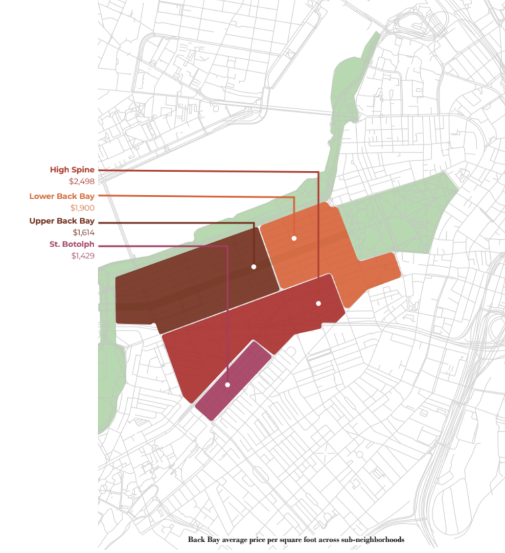 For our data tracking purposes, we break the Back Bay into four smaller clusters. Each one is detailed in the following pages and has its own culture within a culture appeal.