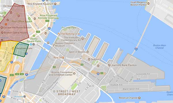 Situated along the harbor at the tip of South Boston, Seaport’s southwestern boundary is formed by Congress Street from Children’s Wharf Park to Massport Haul Road.