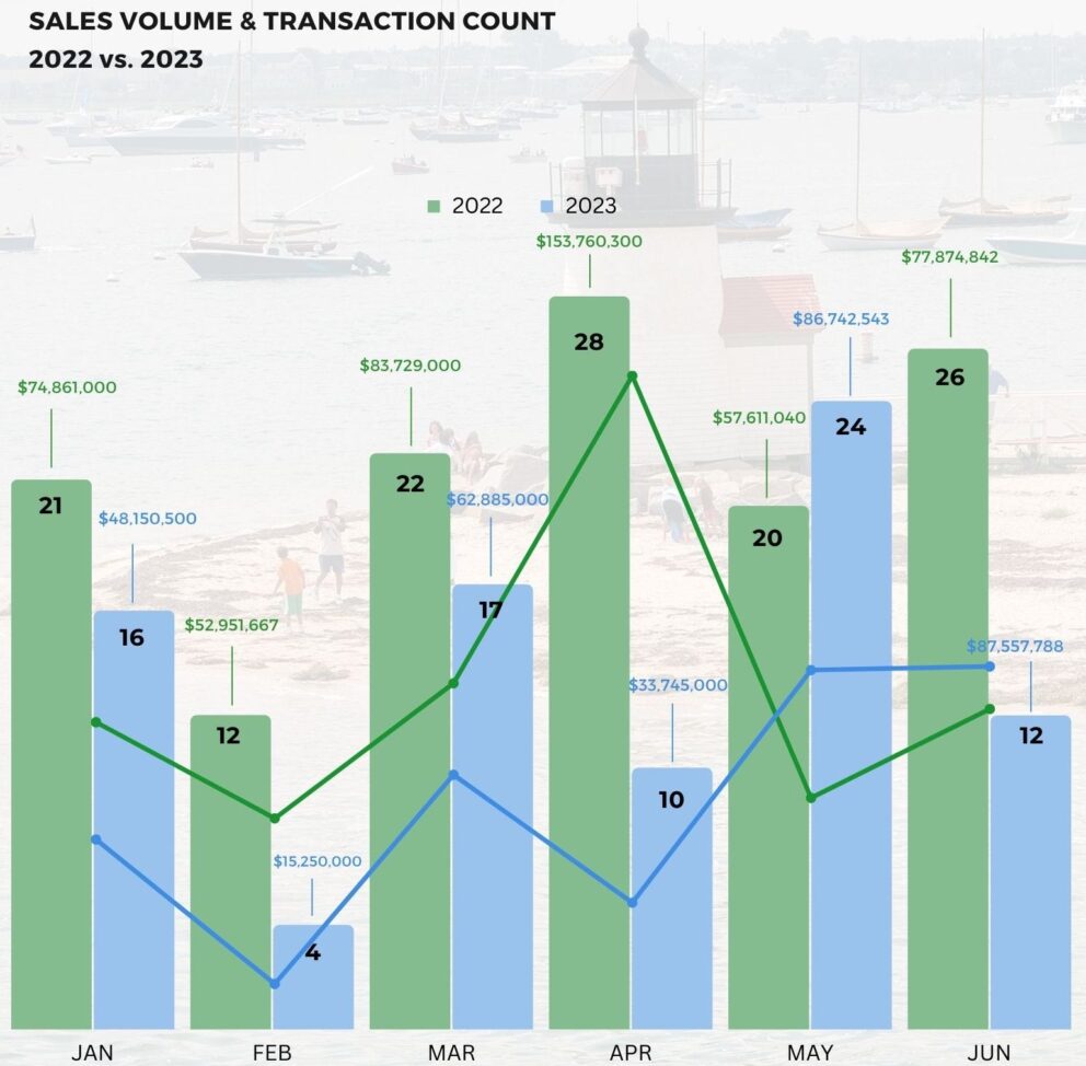 While transaction count and sales volume have decreased on Nantucket relative to 2021 & 2022, inventory remains low and demand hasn’t dropped significantly, which is keeping prices as high as ever. We’re slowly returning to the pre-pandemic “normal,” and if we see an increase in inventory, we’ll be right back to pre-pandemic levels.