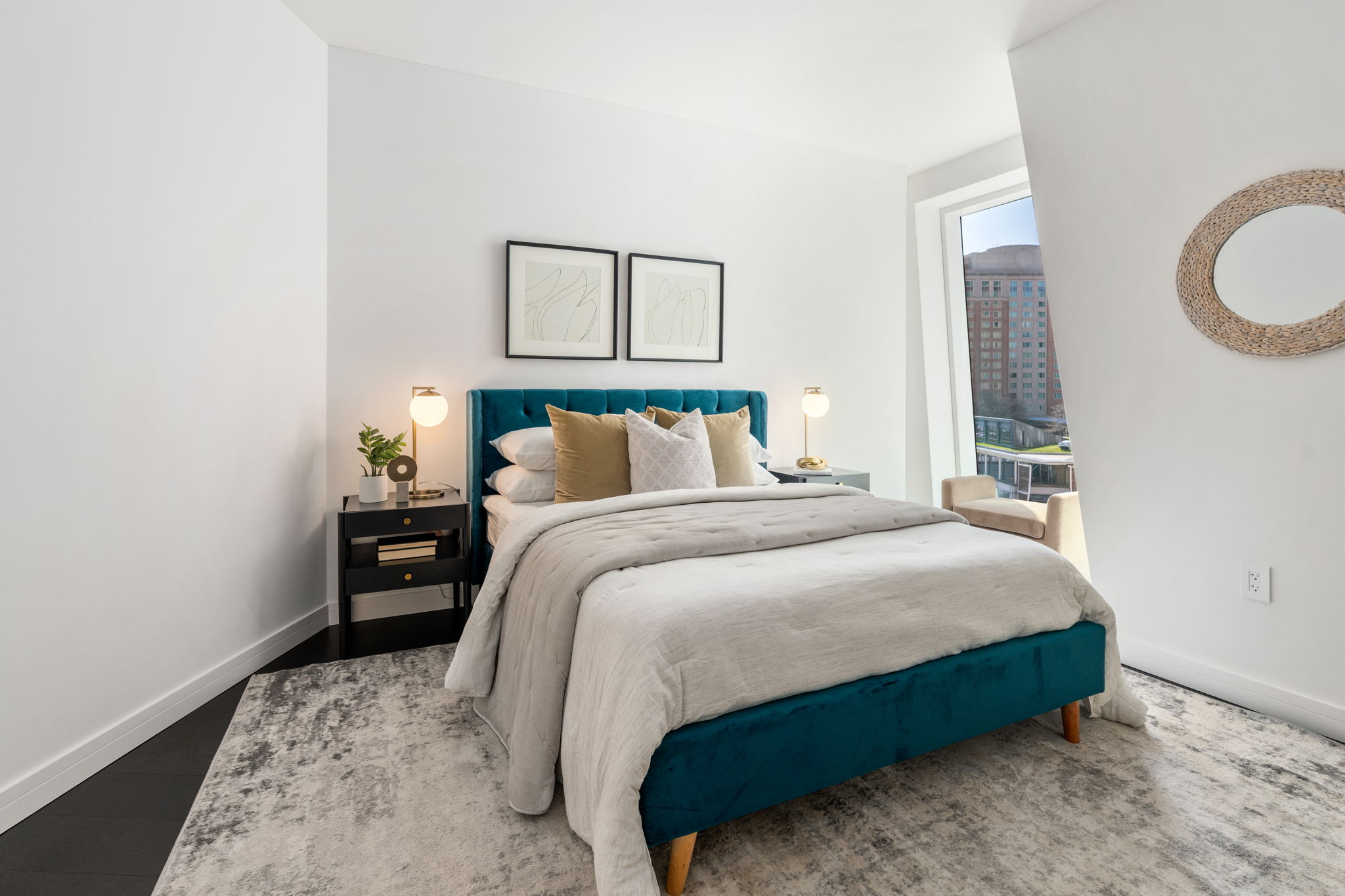 The primary bedroom features waterfront views where you can see all the way out to the harbor islands. A corner window exposure provides this room with an abundance of sunlight. Plus, two walk-in closets give you an abundance of storage and an elegant en-suite primary bath has high end fixtures and heated floors. The second bedroom features city views. This bedroom also has an en-suite bathroom and a bathtub.