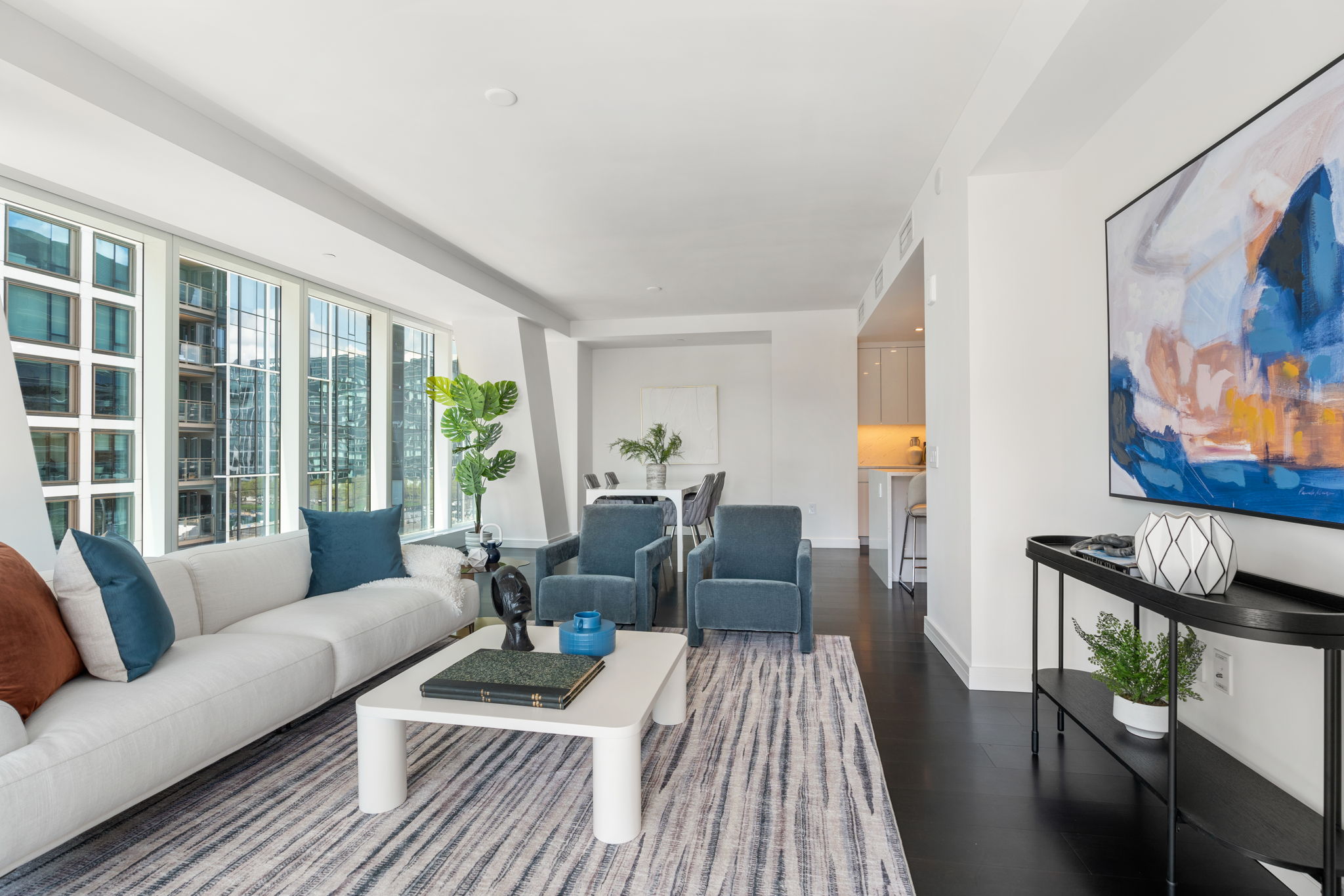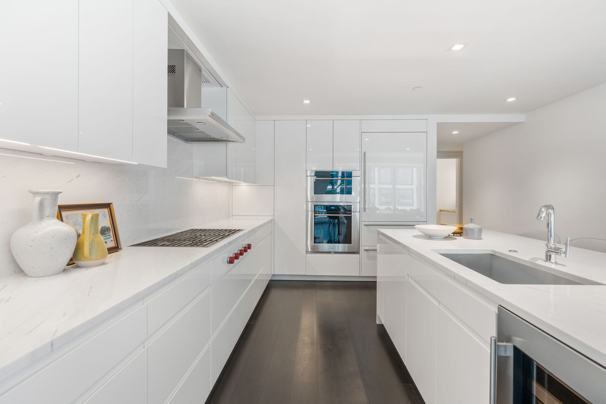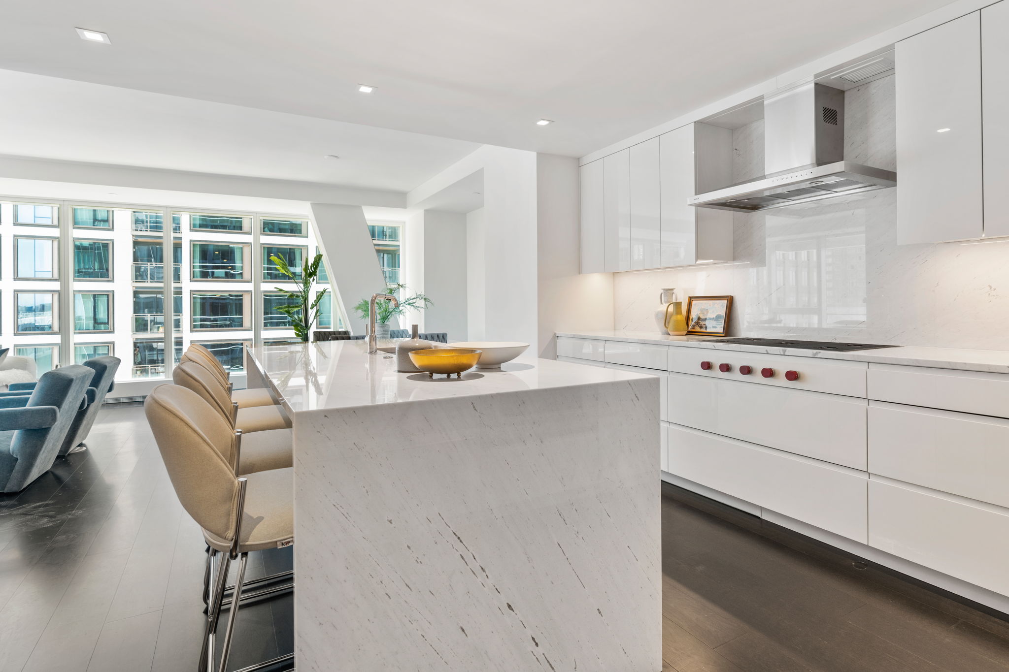 Upon entering the unit you will find the primary and other bedrooms to the left, and as you continue down the gallery, the space opens into a stunning kitchen and living/dining area with a large balcony. The corner window exposure floods the space with natural light. The large open-concept living and dining area steps you toward the waterfront balcony. In the kitchen, the Wolf and sub-zero appliances and Italian wood cabinets create a cooking space of the highest quality. Off the kitchen there is a den, perfect for an in-home office or media room.