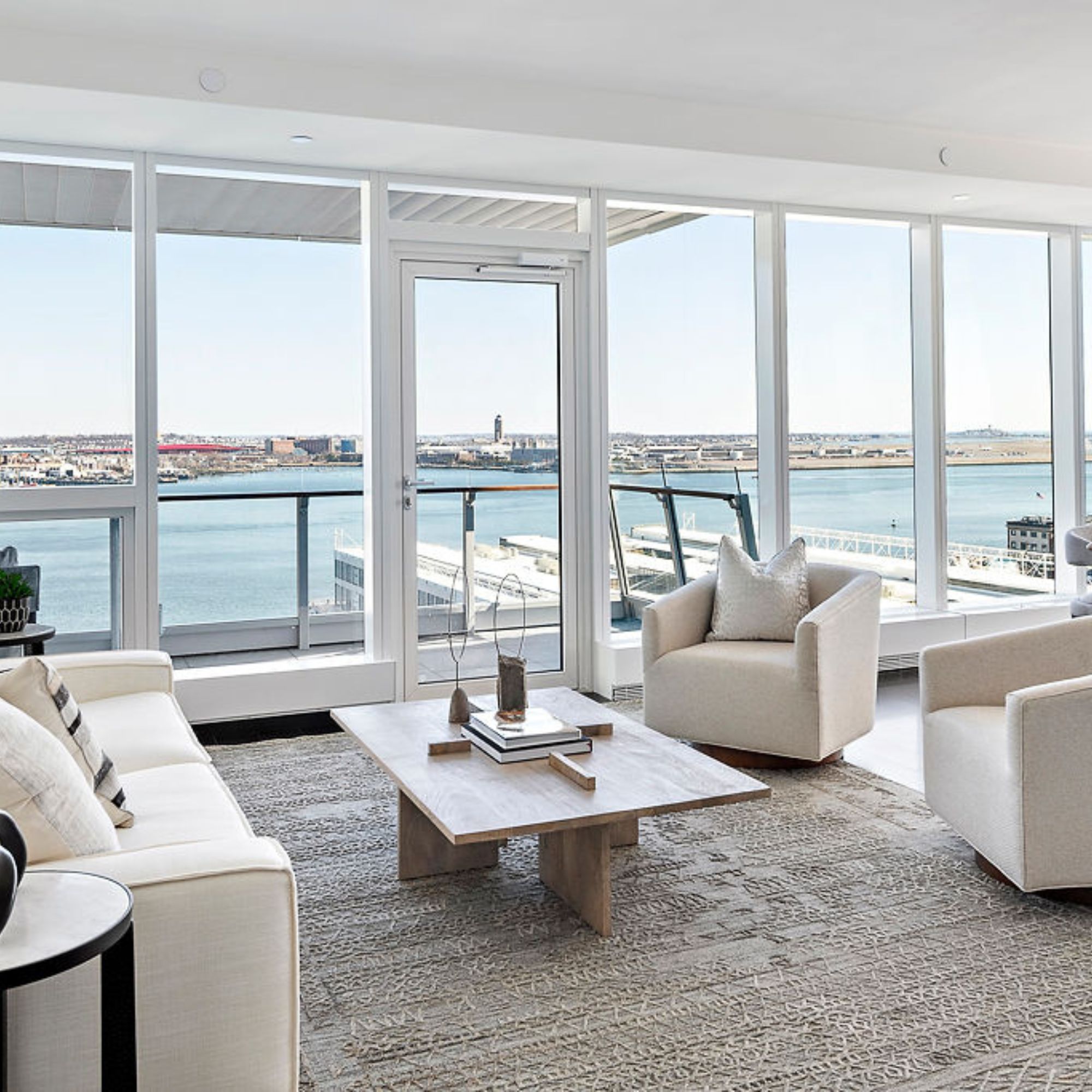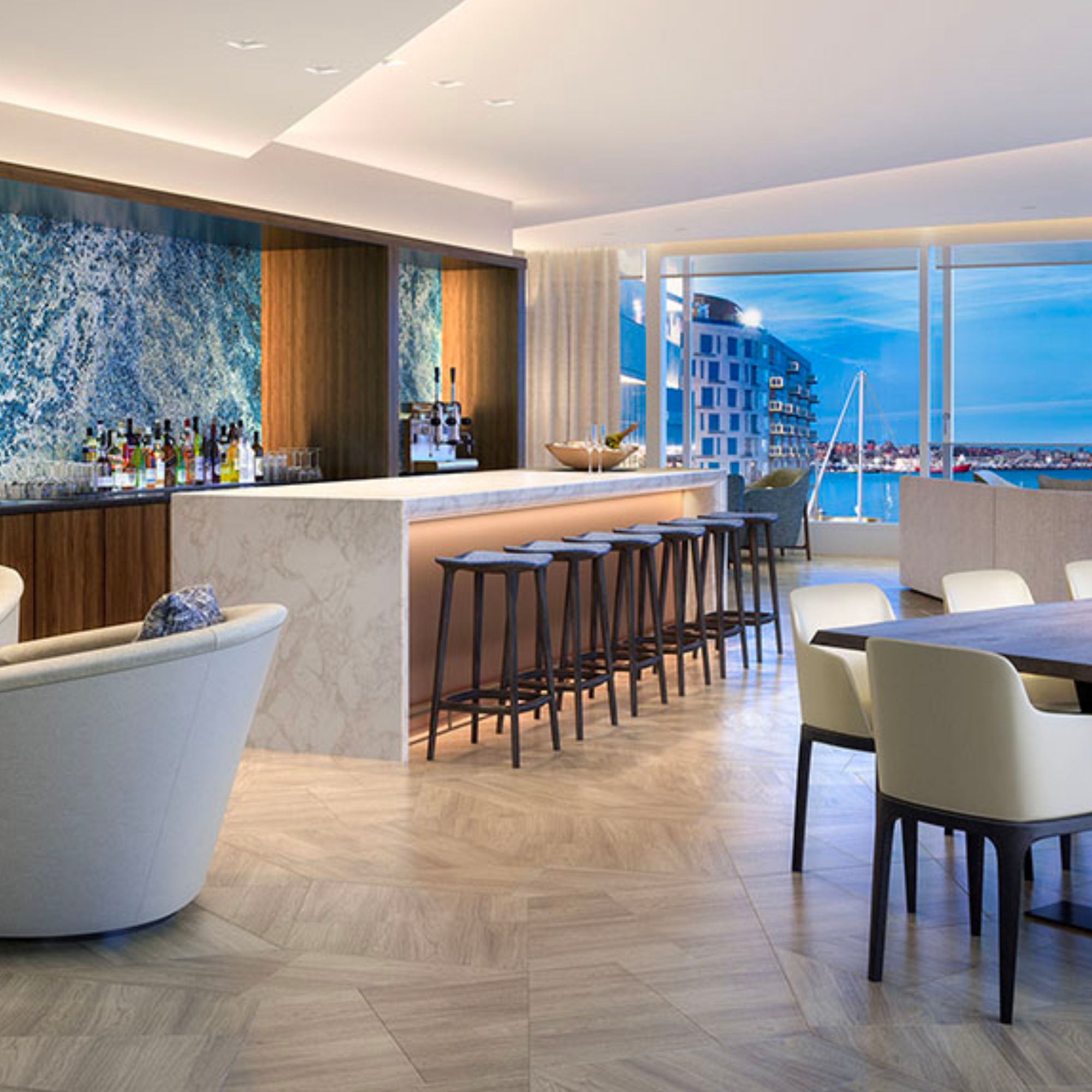 The amenity level of the building will indulge your senses with 12,000 SF of space to enjoy. The signature indoor/outdoor, hand-tiled swimming pool’s infinity edge nearly spills into the Boston Harbor. The spa rooms, sports simulator and gym complement the pool while the expansive lounge area sits directly over the water as well.