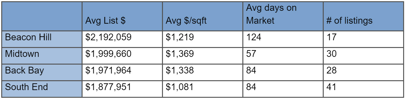 Perhaps not surprisingly, Beacon Hill topped the charts with the most expensive listing at $12,950,000 for one of the most coveted addresses in Boston,
