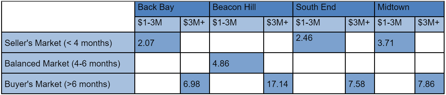 Across the board buyers have the advantage in the ultra luxury market ($3M+). Back Back, South End and Midtown are all hovering at a relatively benign