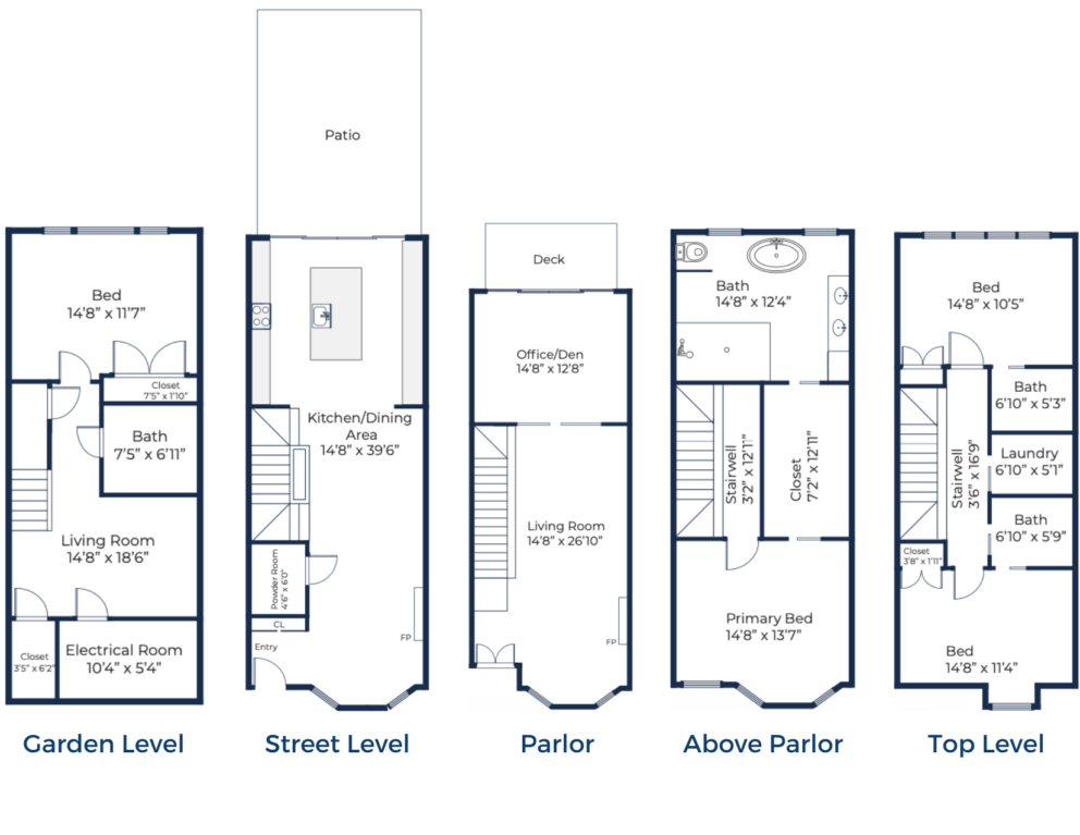 The heart of the home on the parlor level is an enviable combination of high ceilings, a central gas fireplace and the signature bow front window. The large surrounded fireplace provides the character and ambiance to make this living room a place to settle into. Behind pocket doors, there is also a den, perfect for a formal office or additional family space. Rounding out this floor is a deck off the office/den, which makes for an ideal fresh air reprieve.