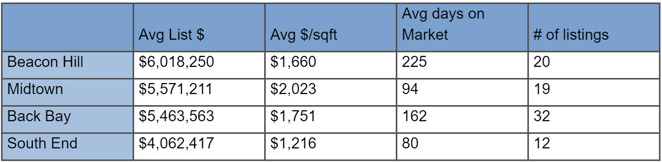 Perhaps not surprisingly, Beacon Hill topped the charts with the most expensive listing at $12,950,000 for one of the most coveted addresses in Boston,